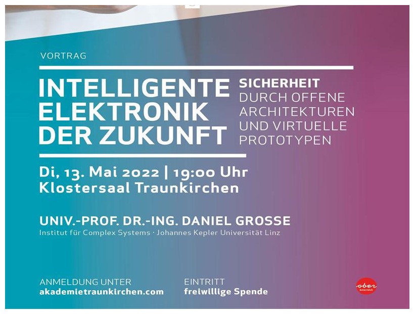May 13, 2022: Daniel Große gave the talk Intelligente Elektronik der Zukunft: Sicherheit durch offene Architekturen und virtuelle Prototypen at the Internationale Akademie Traunkirchen.